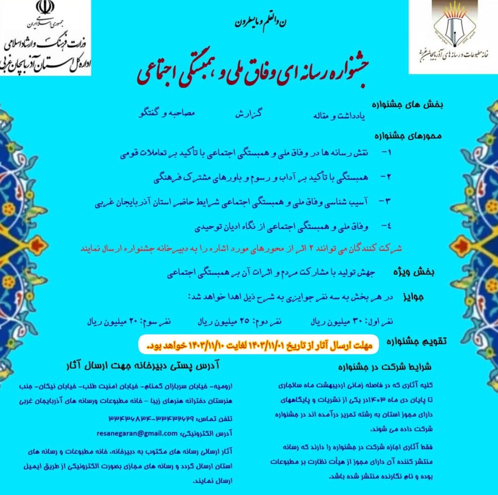 مهلت ارسال آثار از ۰۱/۱۱/۱۴۰۳ لغایت ۱۰/۱۱/۱۴۰۳ خواهد بود.