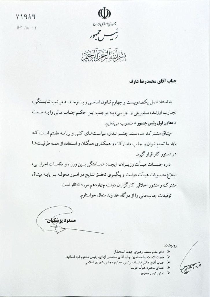 سعود پزشکیان رئیس جمهور چهاردهم در حکمی «محمدرضا عارف» را به عنوان معاون اول خود منصوب کرد