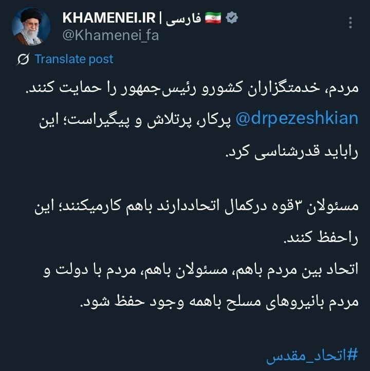 مردم، خدمتگزاران کشور و رئیسجمهور را حمایت کنند. دکتر پزشکیان پرکار، پرتلاش و پیگیراست؛ این راباید قدرشناسی کرد. مسئولان ۳قوه درکمال اتحاددارند باهم کارمیکنند؛ این راحفظ کنند. اتحاد بین مردم باهم، مسئولان باهم، مردم با دولت و مردم بانیروهای مسلح باهمه وجود حفظ شود.